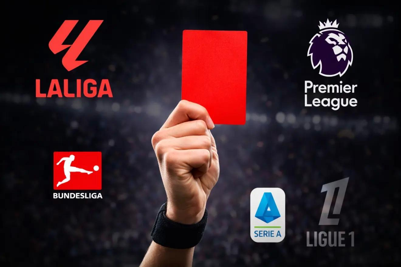 与其他四大联赛相比,西甲在红牌数量上优势明显:65张红牌,远高于法甲(54张)、意甲(33张)、德甲(31张)和英超(27张)。以英超为例,预计到赛季结束,两联赛间的红牌差距将接近40张。