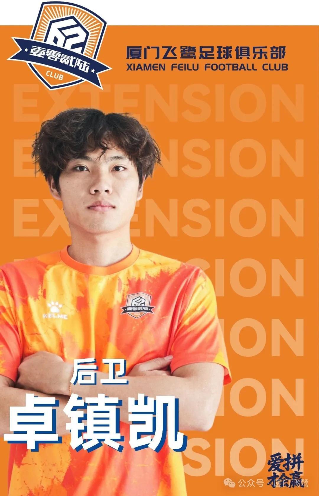 经俱乐部与卓镇凯友好协商,现正式宣布,卓镇凯将在2026赛季继续为厦门飞鹭足球俱乐部效力,双方已签署续约协议。